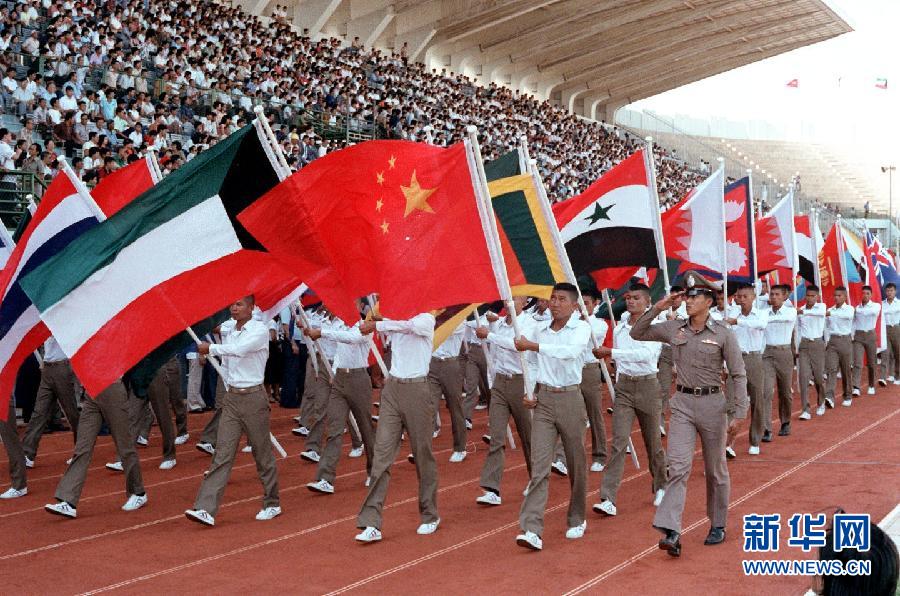 第八屆亞運會于1978年12月9日至20日在泰國首都曼谷舉行,25個國家和地區的2879名運動員參賽。本屆亞運會產生201枚金牌,日本以70枚金牌繼續占據獎牌榜首席,中國獲得51枚金牌,排名第二,開始動搖日本在亞洲體壇的統治地位。韓國在獎牌榜上列第三位。這屆亞運會創造了66項新的賽會紀錄。圖為第八屆亞運會開幕式上旗隊入場。新華社發