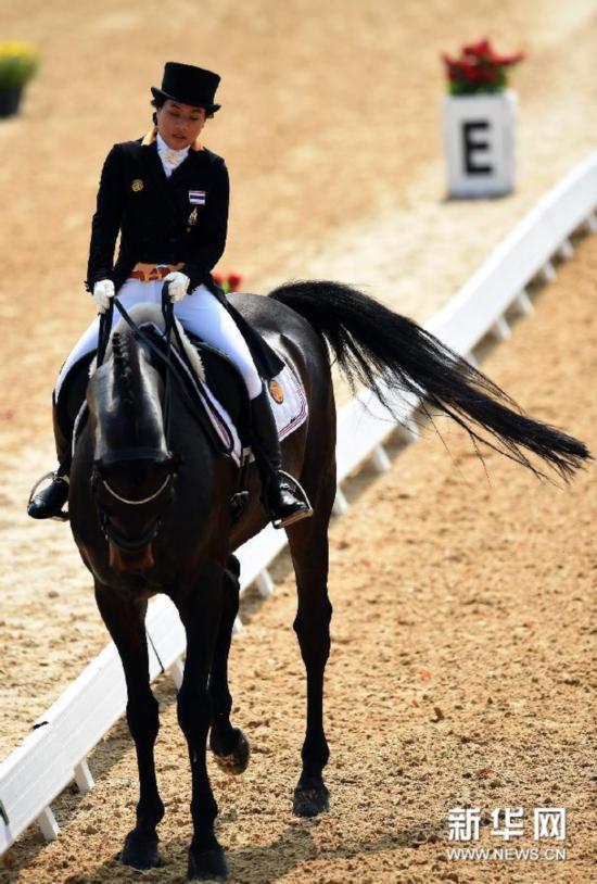 (亞運會·多棱鏡)馬術——泰國公主騎手身份亮相亞運賽場 9月20日,泰國公主詩麗婉娜在比賽中。當日,在仁川亞運會馬術比賽盛裝舞步團體決賽中,泰國公主詩麗婉娜亮相馬術賽場,成為眾多盛裝舞步騎手中的一員,泰國隊以64.289分獲得第七名。新華社記者韓瑜慶攝