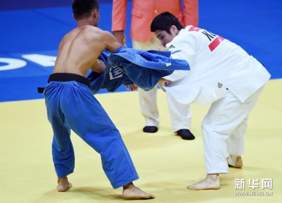(亞運會·多棱鏡)柔道——別搶我衣服 9月20日,中華臺北選手蔡明諺(左)和韓國選手金元鎮(音譯)在比賽中。當日,在2014仁川亞運會柔道男子60公斤級的比賽中,韓國選手金元鎮戰勝中華臺北選手蔡明諺。 新華社記者藺以光攝