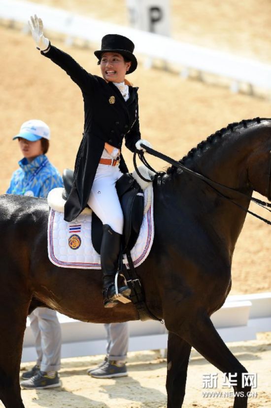 (亞運會·多棱鏡)馬術——泰國公主騎手身份亮相亞運賽場 9月20日,泰國公主詩麗婉娜在比賽中。當日,在仁川亞運會馬術比賽盛裝舞步團體決賽中,泰國公主詩麗婉娜亮相馬術賽場,成為眾多盛裝舞步騎手中的一員,泰國隊以64.289分獲得第七名。新華社記者韓瑜慶攝