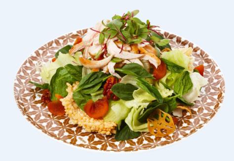 白色蔬果陰生津; 紅色的蔬果有益心血管健康;綠色的蔬菜能降秋燥,抗氧化;橘黃色的水果富含維生素;褐色的堅果類能提供豐富的脂肪和蛋白質。這一季必品閣的當季色拉五色紛呈,在原有的經典色拉基礎上新增加了幾款秋天的元素,如香脆藕片、小蘋果、核桃,還特為設計了清新的柚子醬汁讓這道特選色拉更加清香爽口。