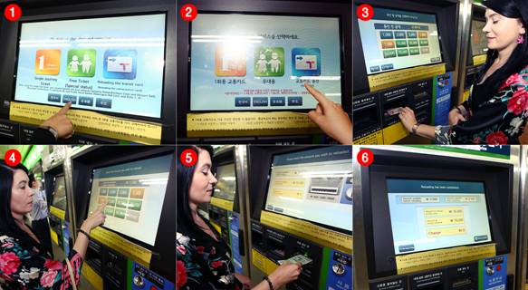 1. 在1次性交通卡銷售、交通卡充值機上選擇相應的語言(韓、英、日、中)。