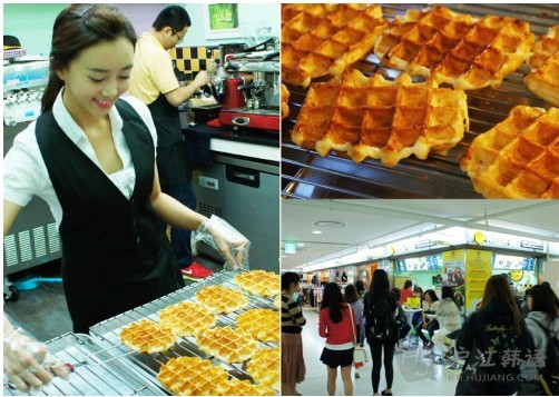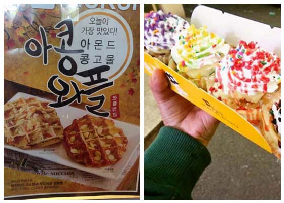 華夫餅是比利時、美國等地最常見的西式餅干。韓國受美國影響比較多,因此華夫餅也成為韓國典型的街頭食品之一,尤其受到小女生們的喜愛。在夏季,冰激凌華夫餅廣受歡迎,而在寒冷的冬天,人們一般會選擇買一份剛出爐的華夫餅。在圓形的威化餅抹上鮮奶油、酸奶或是果醬,對折起來吃,口感酥脆,回味無窮。