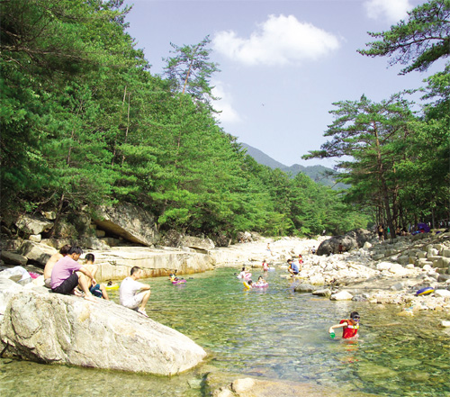“用夏九曲”是位于月岳山主峰靈峰南邊的萬壽峰和東南邊的文繡峰之間的溪谷。人跡罕至的原始森林和沒有苔蘚的清澈溪水同巖石相映成趣。夏天跳入溪谷,可以感受到滲入骨髓的涼爽;秋天還可以觀賞到與溪谷相映成景的楓葉。它與松界溪谷一起,成為月岳山國立公園的代表性溪谷。過去因為交通不便,只有周邊人群能欣賞到的景點,如今因為有非常發達的交通網絡,游客絡繹不絕。