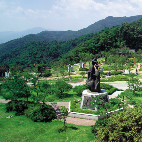 越過彎彎曲曲的山路,樸達嶺蜿蜒于眼前,與磅礴的高山和湛藍的天空相接,好似一幅美麗的畫卷。樸達嶺的舊稱為“二登嶺”。后因朝鮮中葉慶尚道的年輕書生樸達和在這里生活的女子金鳳(音)之間的凄美愛情而得名。為完成樸達和金鳳的心愿,人們在樸達嶺建造了以兩人愛情故事為背景的木雕刻公園。如今開車只要10多分鐘就可以越過樸達嶺,但據說在以前,要想越過樸達嶺得走上幾天山路。由于山路本身就很險峻且陡峭,加上樸達樹郁郁蔥蔥,不僅有老虎等深山里的野生動物隨時出沒,勒索過路行人的盜賊也很多。因為路途太過艱險,傳聞路過這個地方的新媳婦很難第二次再回娘家。因此悲痛的新媳婦淚涌而出,有了“哭著越過的樸達嶺”這首歌。