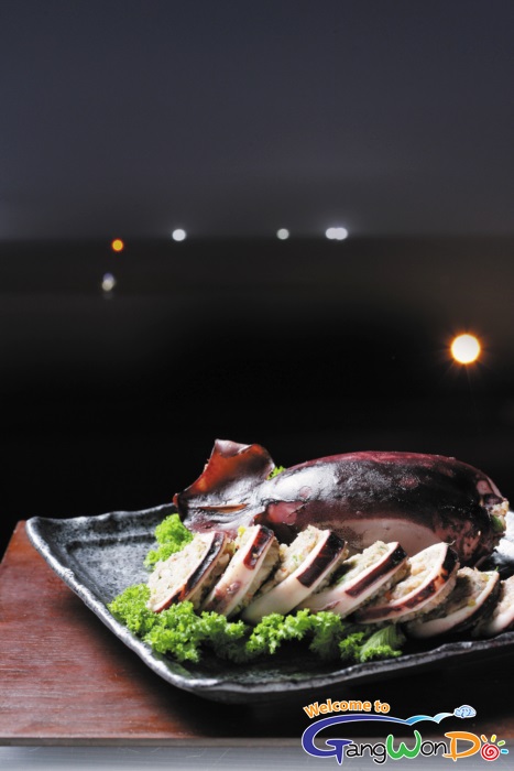 將剛捕捉的新鮮魷魚清洗干凈,保持其體態的完整,然后將豬肉、青椒、蘿卜、蒜等搗碎后填充在魷魚體內,蒸熟即食。這道菜堪稱韓國束草市代表性的傳統美食。