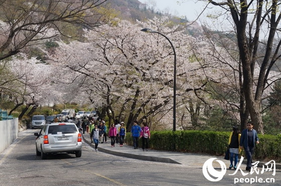 南山位于首爾市中心地帶,海拔雖有262米,但在櫻花綻放的時節,更多市民選擇南山循環路步行上山,因為一路上櫻花與金達萊、迎春花競相開放,美不勝收。一路櫻花看盡,不知不覺中就到了南山頂的首爾塔。登上塔頂眺望整個首爾,你會發現高樓聳立、車水馬龍的這個城市被一簇簇櫻花點綴,渲染出一幅巨大的水彩畫。