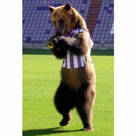 這頭俄羅斯熊名叫尤吉,來自西班牙巴利亞多利德“大世界馬戲團”。在皇家巴利亞多利德球場中,它正在為觀眾和球員表演吹喇叭節目。