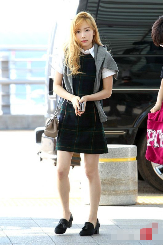 墨綠格子群加上黑色流蘇粗跟鞋,甜美清新。短袖白色襯衫內搭和隨意搭在肩頭的毛衣為整體色彩和層次加分不少,顯得隨性不隨意。