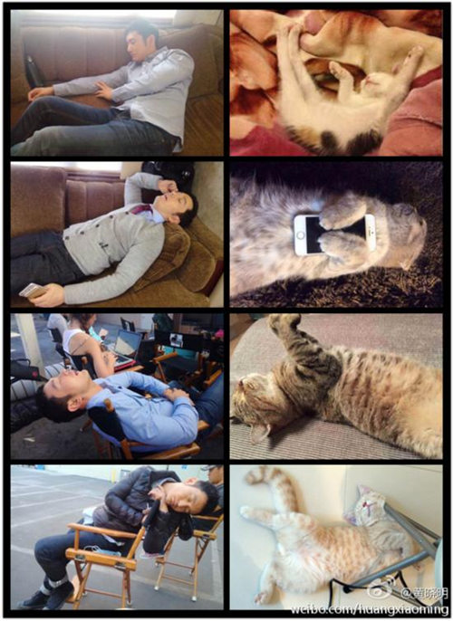去年11月2日上午,黃曉明在微博上分享了一組萌照,并說道:“他們說我睡覺的姿勢跟貓有一拼,所以讓我不要再做教主,要去做覺主?!闭掌?,黃曉明睡姿酷似喵星人,十分銷魂,有在沙發上仰躺側臥的,也有趴在椅子上的高難度轉體,跟baby之前的一組照片非常相似。