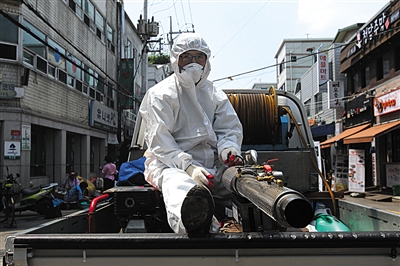 6月12日,韓國首爾,工人在街頭噴灑消毒劑。