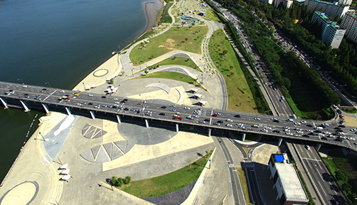 盤浦漢江公園以盤浦大橋為中心,位于漢南大橋和銅雀大橋之間。公園里最不能錯過的景點就是月光彩虹噴泉。月光彩虹噴泉全長1140米,作為世界上最長的橋型噴泉榮登吉尼斯世界紀錄。到了晚上,噴泉噴起的水花在200多個照明燈的照射下,像七色彩虹一般無比美麗。登上銅雀大橋南邊的觀景臺,可以眺望漢江全景,將美麗的江面風景和鱗次櫛比的樓群盡收眼底。