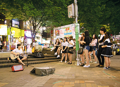 作為海外網記者,我此前一直在關注韓國正在流行的中東呼吸綜合征疫情。此次第一次訪問韓國,盡管病情有所緩解,但心中還是懷有幾分忐忑。不過一到韓國,我懸著的心便放了下來——所到之處,大街上、酒店里、商場中、地鐵上……并沒有感受到任何疫情的緊張氣氛,除了個別老年人和少數游客外,韓國當地人幾乎都沒有戴口罩的情況,似乎韓國人的日常生活并沒有受到干擾。街頭隨處可見許多年輕情侶,吃路邊攤、喝啤酒,甚至還有藝人在街邊唱歌彈琴——現在的首爾并沒有想象中的可怕和擔憂。