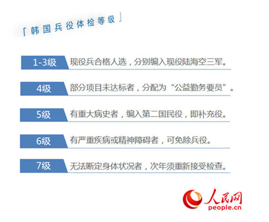 眾所周知,韓國實行義務征兵制。根據韓國兵役法規定,韓國籍男性需在19歲時接受兵役廳體檢,并在20至30歲期間根據體檢等級和相關規定入伍服兵役。韓國兵役體檢等級共分7級,其中1至3級是現役兵合格人選,分別編入現役陸??杖?。4級則是部分項目未達標的人員,會被派遣至國家及地方政府機構或公共團體做“公益勤務要員”。5級人員會被編入第二國民役,僅在緊急情況時出動。6級則是屬于有嚴重疾病或精神障礙的人員,可免除兵役。7級則視為無法斷定身體狀況,次年須重新檢查。不同兵種的服役期限也略有不同,一般服役期限為21個月。