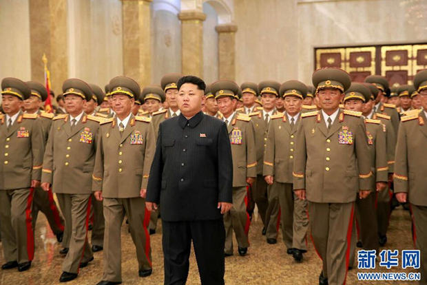 朝鮮最高領導人金正恩(中)于27日零時前往安放朝鮮已故領導人金日成和金正日遺體的錦繡山太陽宮進行參謁,紀念朝鮮祖國解放戰爭勝利62周年。朝鮮人民軍陸軍、海軍、航空與防空軍儀仗隊和朝鮮工農赤衛隊成員向金日成、金正日雕像敬禮。金正恩和朝鮮人民軍官兵向雕像敬獻花籃并鞠躬致敬。新華社/朝中社