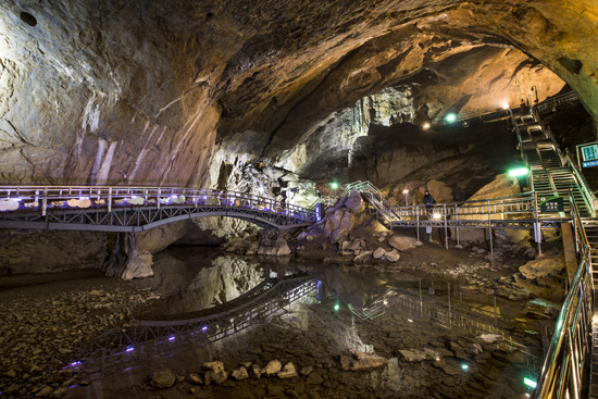 三陟的德項山(海拔1071米)一帶是韓國洞穴最密集的地區。面積達6.6平方公里的大規模三陟洞窟地帶就坐落著七個天然洞穴,其中能夠進入的只有幻仙窟與大金窟?;孟煽呷肟谖挥诤0?00米,走過去需要30分鐘?;孟煽吒叨群芨?,規模之大更是其他洞穴無法比擬的。整體長度達6.2公里,然而游客只能進到約1.6公里處。