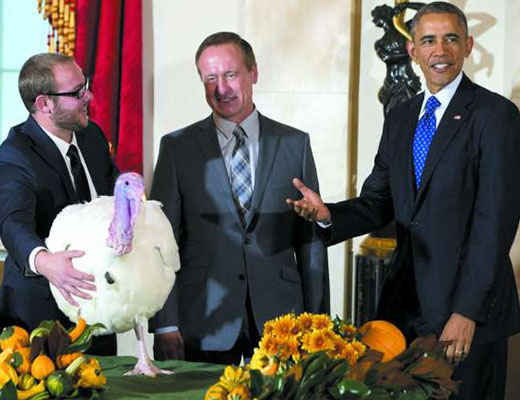 2014年11月26日,美國總統奧巴馬第6次在白宮參加赦免火雞的儀式?;痣u是美國人慶祝感恩節的傳統食物,在感恩節前一天赦免兩只火雞,使其免于成為人們的大餐已成為白宮的節日傳統。榮獲赦免的火雞,會被送到動物園等地“頤養天年”,直到自然死亡。每只火雞的平均壽命大約為3到4年。