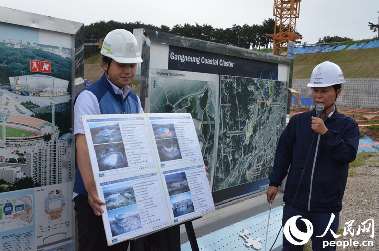 江陵奧運公園負責人介紹施工情況。(拍攝:樸寶英)