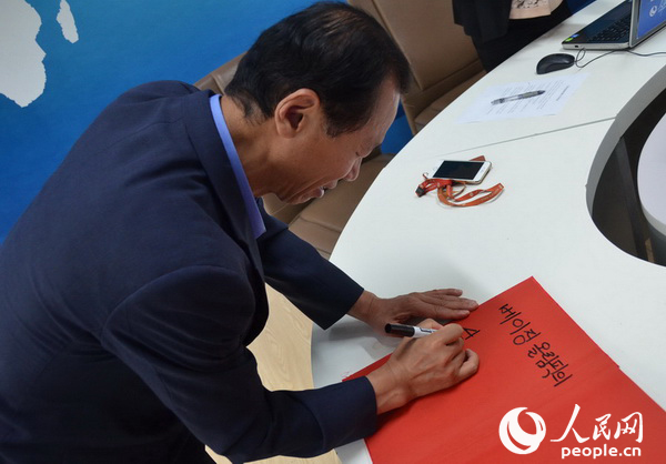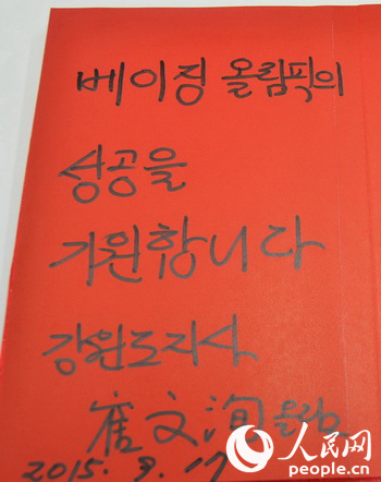 韓國江原道道知事崔文洵親筆寫下“祝愿北京冬奧會成功”。(攝影:于凱)