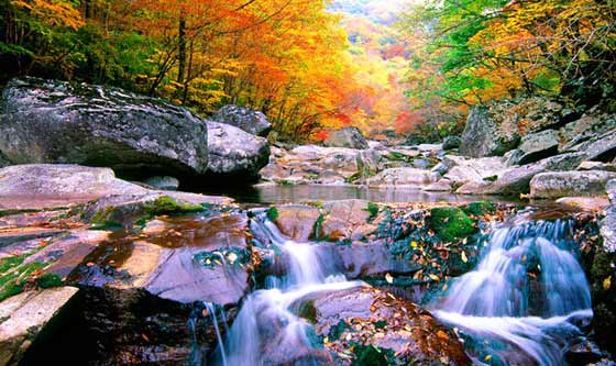 韓國是個多山之國,橫貫全羅北道、全羅南道和慶尚南道的智異山則被譽為韓國眾山中最美的山脈。智異山的楓葉稍晚于雪岳山,每年10月上旬才開始變色。10月下旬則是智異山丹楓的全盛時期,山上、路邊的楓葉都染上絢麗色彩,可謂是“樹樹皆秋色,山山唯落暉”,美不勝收。