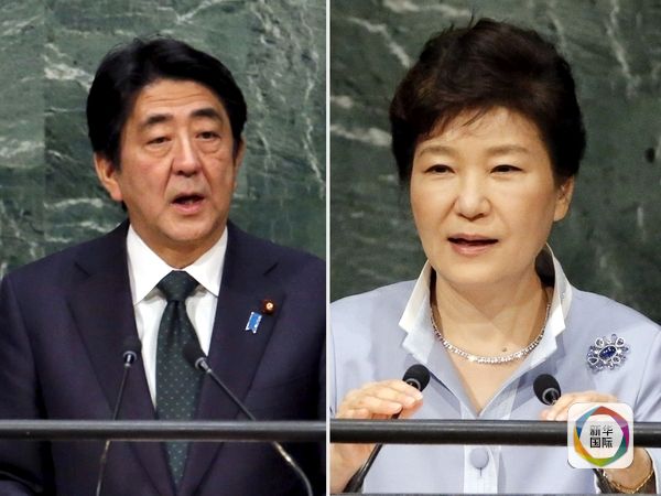 接片:日本首相安倍晉三(左)和韓國總統樸槿惠在聯合國可持續發展峰會上致辭。(圖片來源:新華/路透)