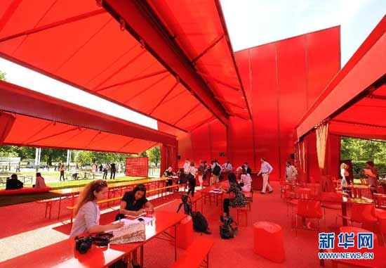 2010年7月6日,在英國倫敦海德公園,人們在2010年度九曲湖藝廊咖啡廳內參觀。從2000年開始,九曲湖藝廊每年邀請一位知名建筑師在藝廊外搭建一座實驗性的臨時建筑作為咖啡廳,以展示不同風格的當代建筑藝術。