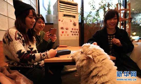 2015年2月11日,在韓國首爾,顧客在咖啡館里與綿羊一起玩耍。據老板李光昊介紹,他在2011年開設了這家新奇有趣的咖啡館?,F在兩只綿羊成為咖啡館的最大賣點,吸引當地人和其他國家顧客的來訪。