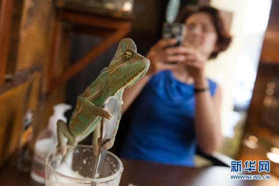 2015年4月17日,在匈牙利首都布達佩斯的“動物園咖啡館”,一名客人用手機拍攝一只高冠變色龍。布達佩斯的這家“動物園咖啡館”養著貓、鸚鵡、倉鼠、兔子、刺猬、松鼠、烏龜和變色龍等多種動物??腿嗽谄穱L咖啡的同時還可以與這些動物親近和嬉戲。