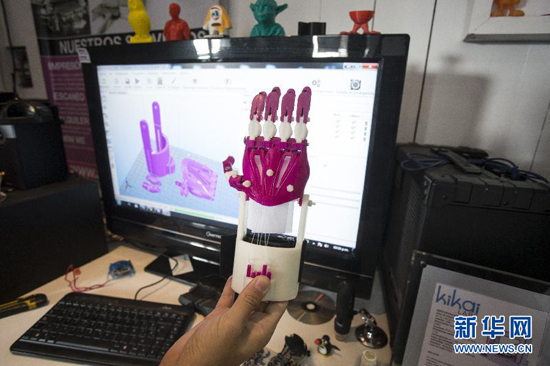 2014年5月9日,在阿根廷布宜諾斯艾利斯的“3D打印愛好者”咖啡館,店主羅德里格·佩雷斯·威斯展示3D打印技術制作的機械手?!?D打印愛好者”咖啡館由阿根廷電子工程師羅德里格·佩雷斯·威斯和電子工程大學生季諾·圖巴羅共同開設。很多愛好3D打印的技術控在這里交換想法,把自己的前衛設計付諸實踐。