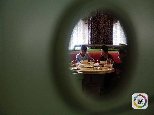 二層餐廳分為圓桌餐廳和自助餐廳。圓桌餐廳共有4個大廳,分布在游船的4個角落,每個廳有5張圓桌,非常適合家庭聚餐、朋友小酌。餐桌正前方還配置有高清電視,正在回放10月10日朝鮮勞動黨建黨70周年閱兵式盛況。熱心的服務員介紹說,目前餐廳菜單還在改進中,會根據顧客的反饋調整菜品種類和式樣,不久會有更加精美的菜單印刷出來,到時候也會有更多可口佳肴提供給客人。她還介紹說,由于餐廳是新開業,每天訪問的客人絡繹不絕,平均日接待游客量達到數千名,客人最多的一天是在開業3天后,造訪游客達到4000余人。