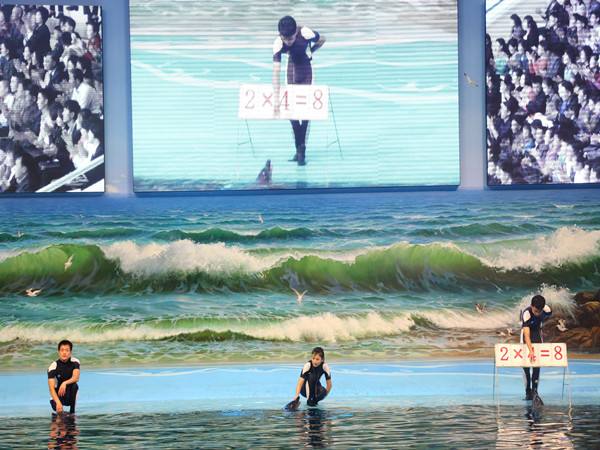 除了海豚表演外,海豚館的女訓練師還穿上人魚服裝,帶來了一場優雅的人魚公主之舞。她們時而漂浮在水面向看臺揮手致意,時而深入水底通過水下鏡頭向觀眾展現婀娜的舞姿。
