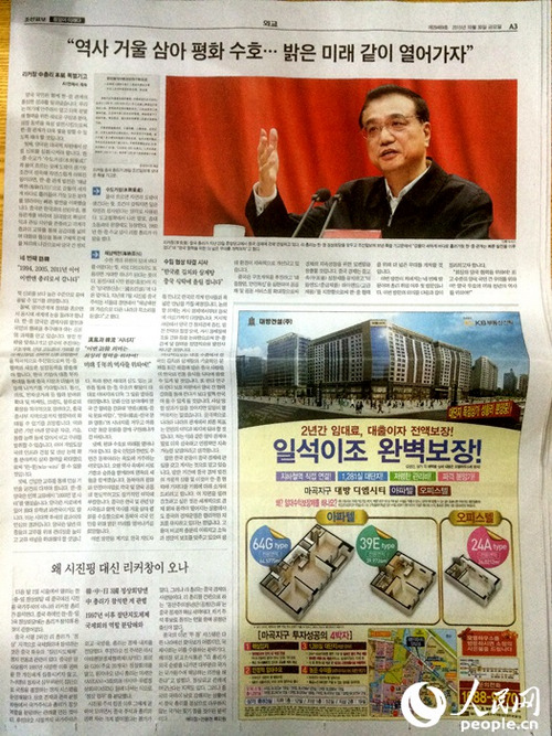李克強總理在韓國《朝鮮日報》發表題為《更好續寫中韓友好的千秋史話》的署名文章。(拍攝:夏雪) |