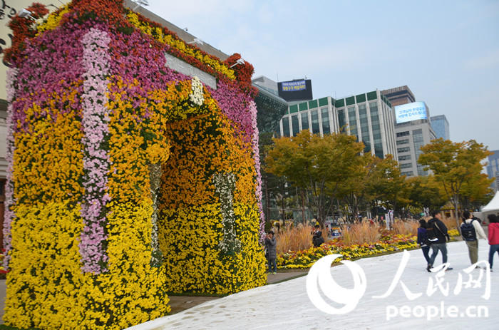 人民網首爾11月5日電(劉亞瓊)10月31日,2015首爾菊花展在首爾廣場附近盛大開幕。五彩斑斕的菊花搭配首爾秋季鋪滿落葉的街道,風景甚是別致。