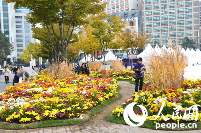 人民網首爾11月5日電(劉亞瓊)10月31日,2015首爾菊花展在首爾廣場附近盛大開幕。五彩斑斕的菊花搭配首爾秋季鋪滿落葉的街道,風景甚是別致。