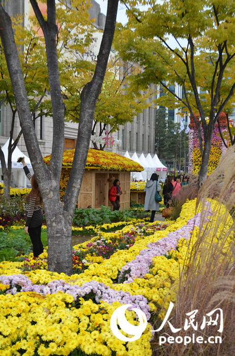 人民網首爾11月5日電(劉亞瓊)10月31日,2015首爾菊花展在首爾廣場附近盛大開幕。五彩斑斕的菊花搭配首爾秋季鋪滿落葉的街道,風景甚是別致。