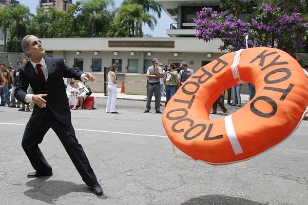 2005年2月16日《京都議定書》正式生效之日, 巴西環保人士在美國駐巴西圣保羅總領事館前舉行示威,抗議美國拒絕批準《京都議定書》。( 新華社發)