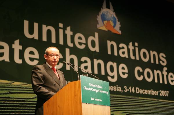 2007年12月3日,《公約》秘書處執行秘書伊沃·德博埃爾在印度尼西亞巴厘島舉行聯合國氣候變化大會的開幕式上發言。( 新華社記者劉宇攝)