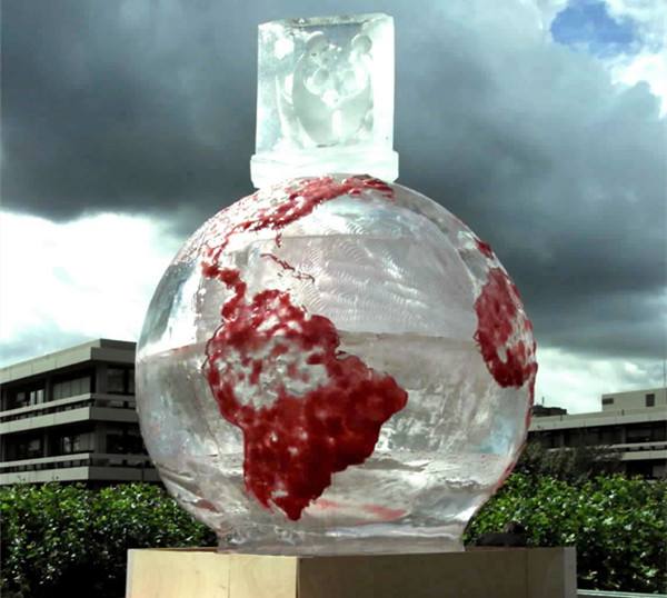 2001年7月,世界野生動物基金會在德國波恩大會新聞中心附近擺放了一個3.5噸的地球冰雕。這個冰雕將逐漸融化,象征著正在變暖的全球氣候。(新華社記者郭勇攝)