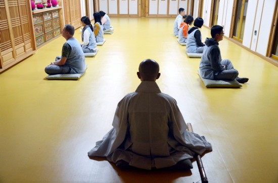 寺廟生活營體驗者在體驗坐禪。