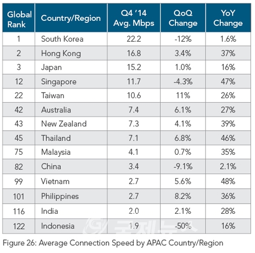 國際電信聯盟(ITU)近日公布了2015年全球網絡連接最好、速度最快的國家和地區排名,韓國榮登榜首。韓國平均網速為22.2Mbps,這一速度相當于美國的2倍,中國的6.5倍,甚至比排名第二的香港還高出了32%。韓國在這份榜單上已連續多年霸占冠軍的寶座,其逆天網速遠超全球其他地區。