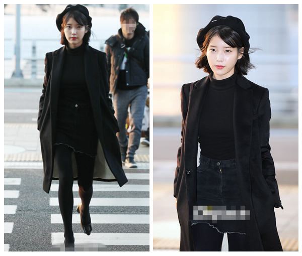 IU的全黑造型乍一看有一種壓抑之感,但齊肩短發搭配貝雷帽減輕了厚重感,展現了俏皮魅力。