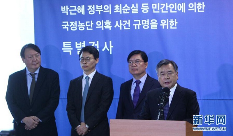 3月6日,在韓國首爾,特別檢察官樸英洙(右一)在新聞發布會上發言!