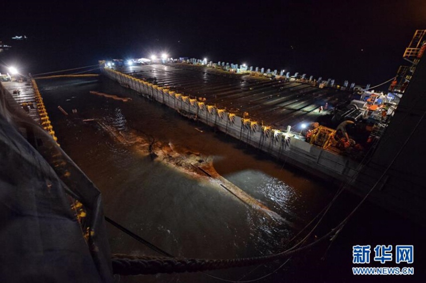 這是韓國全羅南道珍島郡附近海域“世越”號沉船打撈現場(拍攝日期不詳)。 3月25日下午,韓國全羅南道珍島郡附近海域“世越”號沉船打撈現場傳出消息:“世越”號船體成功整體起浮出水。這意味著“世越”號打撈工作基本宣告成功。新華社發