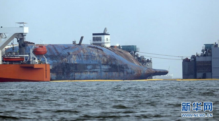 這是3月26日在韓國珍島郡附近海域拍攝的半潛船上的“世越”號船體。 24日午夜前,“世越”號船體在半潛船上指定位置就位。25日凌晨,半潛船開始排水起浮。25日下午,銹跡斑斑的船體整體出水,打撈作業最關鍵也是最困難的“整體起浮”階段取得成功。這意味著“世越”號打撈工作基本宣告成功。新華社/美聯