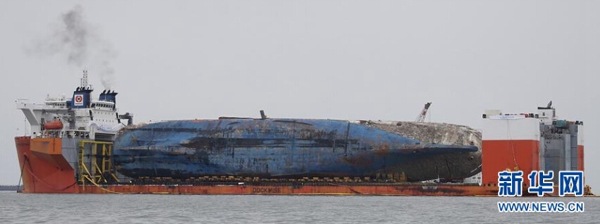 這是3月26日在韓國珍島郡附近海域拍攝的半潛船上的“世越”號船體。 24日午夜前,“世越”號船體在半潛船上指定位置就位。25日凌晨,半潛船開始排水起浮。25日下午,銹跡斑斑的船體整體出水,打撈作業最關鍵也是最困難的“整體起浮”階段取得成功。這意味著“世越”號打撈工作基本宣告成功。新華社/美聯