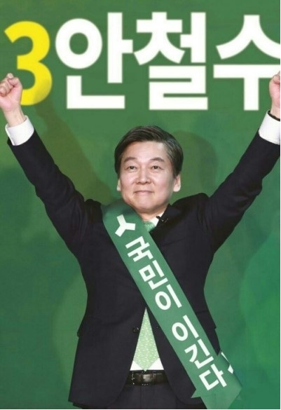 國民之黨候選人安哲秀的宣傳海報整體以綠色為主,但“國民之黨”的字樣卻沒有出現。安哲秀佩戴的肩帶前段印有國民之黨的黨徽,豎排寫著“國民勝利”,他上揚雙臂,面帶微笑。