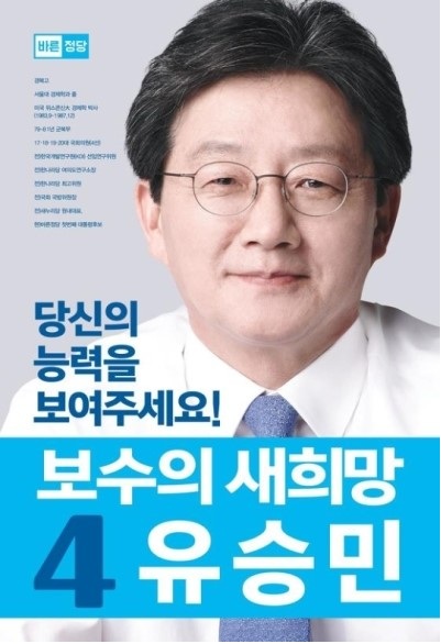 正黨候選人劉承旼的海報主色調為天藍色,下端寫著“保守的新希望:4號劉承旼”,中間則寫著“展現你的能力吧!”的字眼。有分析認為,與自由韓國黨同為保守陣營的正黨此次采用天藍色作為主色調,主要是為了區分于自由韓國黨。
