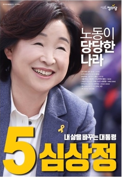 正義黨候選人沈相奵的海報背景為暗灰色,右上方寫著“勞動造就堅實的國家”的宣傳口號。沈相奵名字的上方寫著“改變我生活的總統”,非常顯眼。
