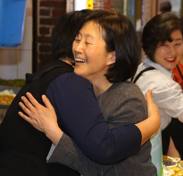 安哲秀夫人金美靜(音)女士4月25日上午到訪京畿道安陽市為丈夫競選活動造勢。