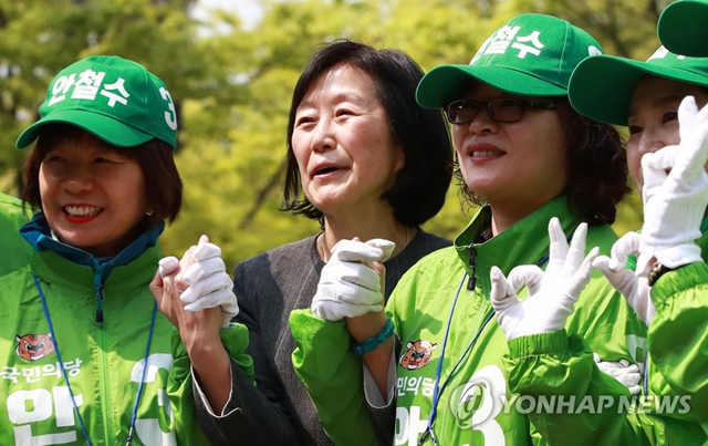 安哲秀夫人金美靜(音)女士4月25日前往首爾麻浦區為丈夫競選造勢。